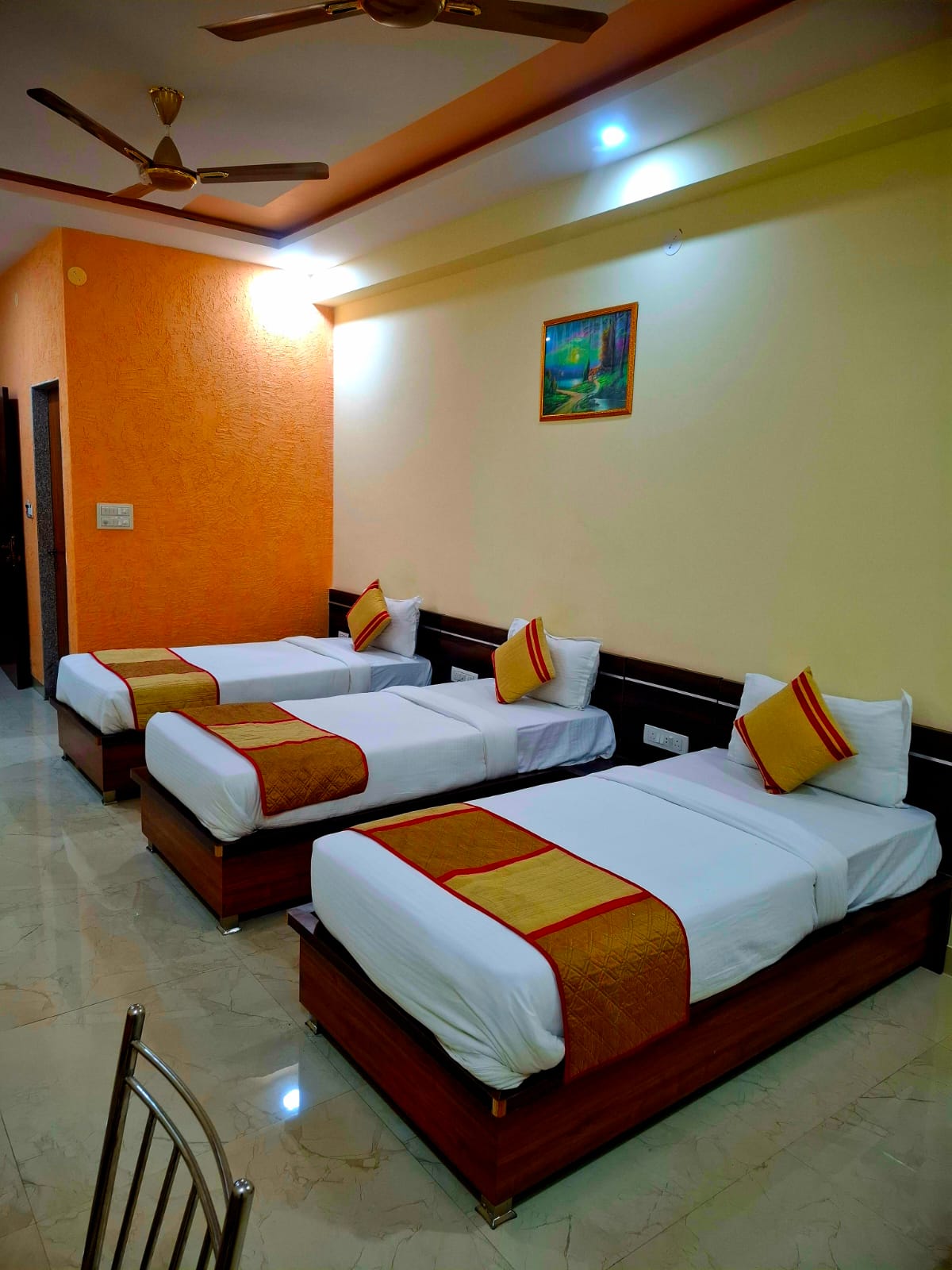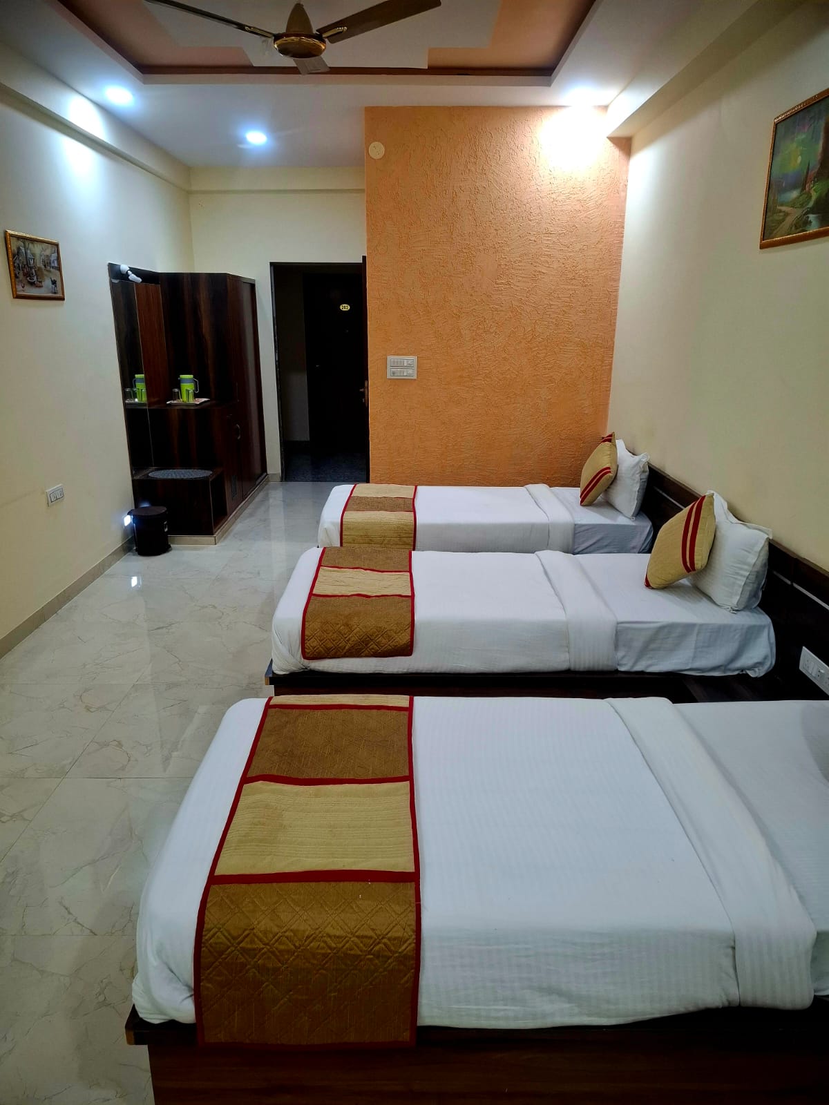 A triple separate bed room includes three single or twin beds, arranged with enough space between them to ensure comfort and privacy. Each bed usually comes with a mattress, pillow, and bedding set, along with a personal storage unit such as a locker, shelf, or cupboard. The room often also includes study tables, chairs, and lighting for each occupant.